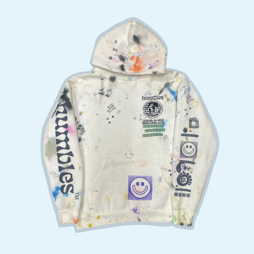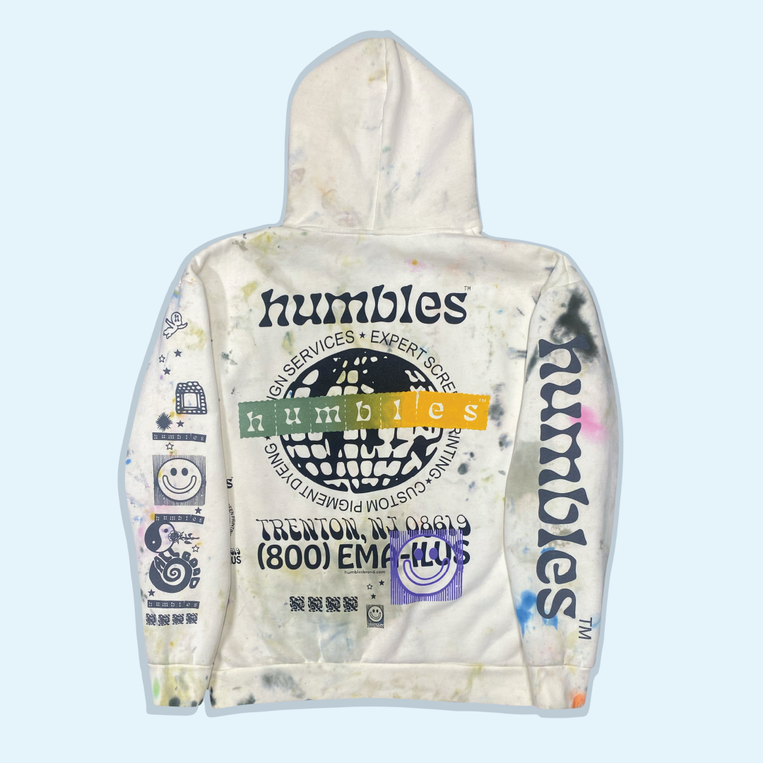 Each Testers hoodie is created using curated graphics pulled from across the Humbles™ studio. Rather than layering prints randomly, every graphic is intentionally positioned on the shirt to mimic the look and feel of a classic print-shop test tee, but with purpose and composition. No two are alike, and each one carries the visual history of the studio’s year of making.